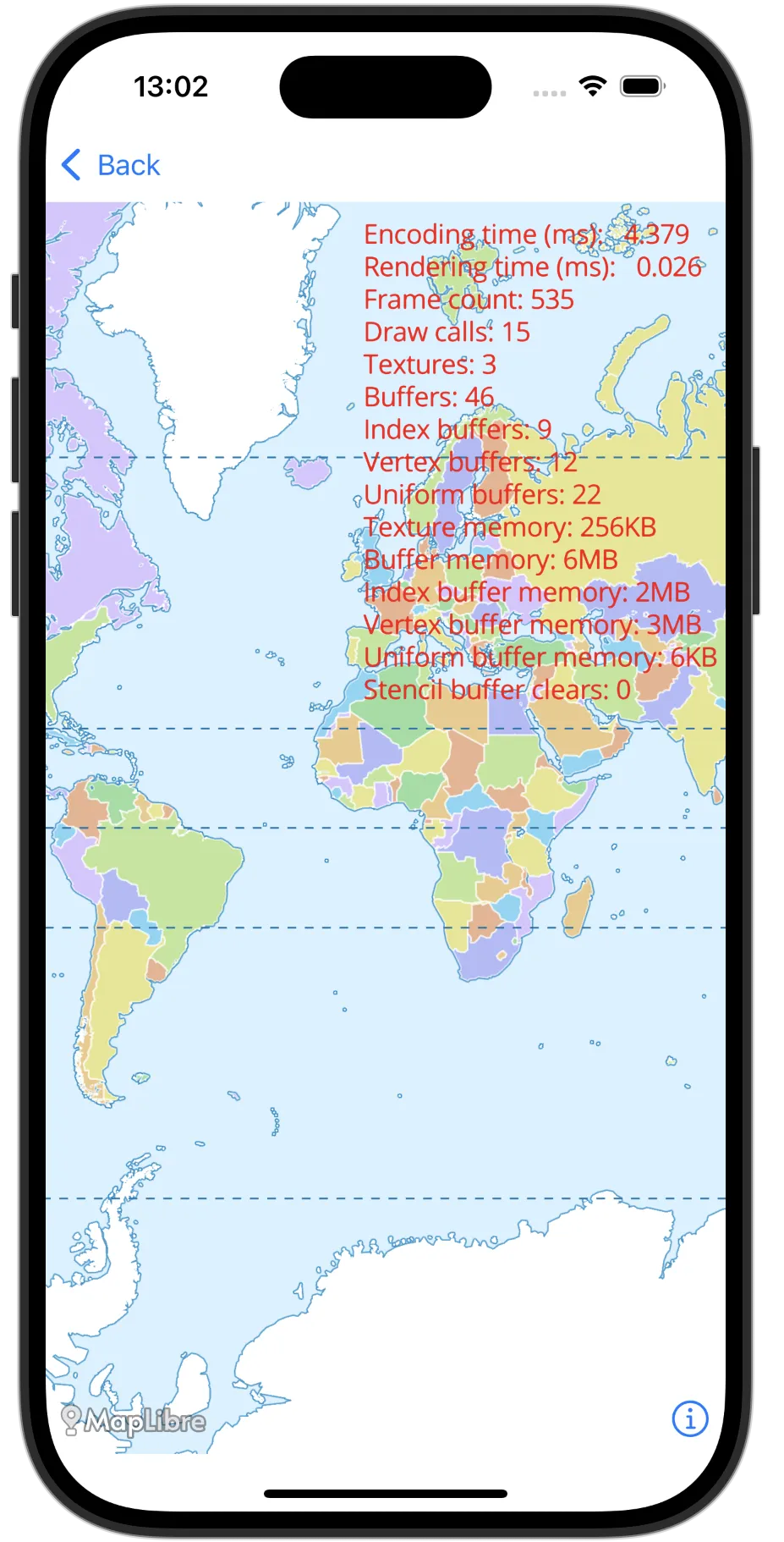 We have also added the ability to toggle a rendering statistics HUD. This is especially useful for users of MapLibre Native on embedded systems.
